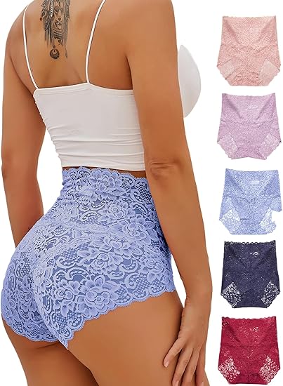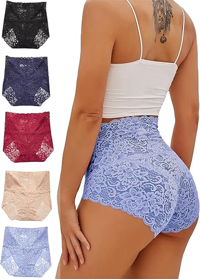 Women's 5 Piece Floral Lace High Waist Briefs Scallop Trim Panties Underwear